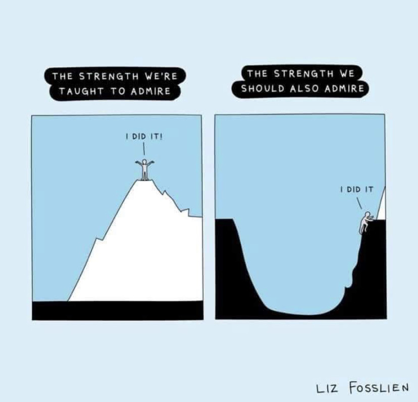 We need to celebrate strength and resilience in all it’s shapes, shades and sizes and we need to be aware that whilst these are great attributes that can be helpful in the face of growth and adversity, they can also be the armour that guards us up from getting support from others. The below illustration really sums it up for me. Let’s celebrate all types of strength, they’re all equally beautiful and inspiring in their own way.
